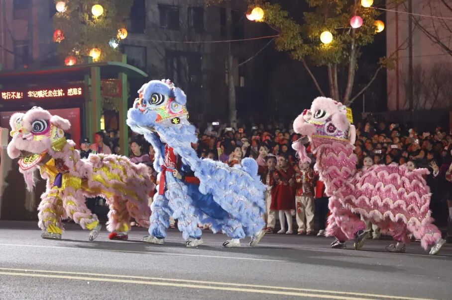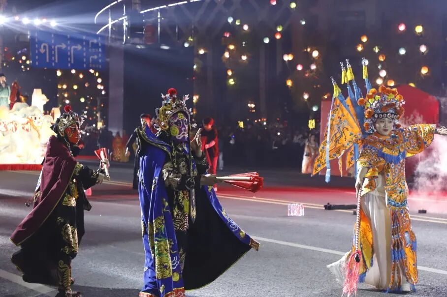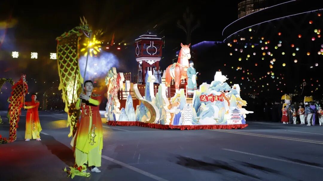 与此同时,一系列非遗节目在花车巡游的沿途轮番上演:达州花灯流光溢彩,发光玩偶穿梭其间互动,为观众送上祝福;川剧变脸、祥狮献瑞带来川味十足的表演与新春祝福;铿锵有力的川东腰鼓,舞出了新春的喜庆与奋进;巴渠杂技的高难动作扣人心弦,赢得阵阵喝彩;《宴通州》节目温情呈现,通过歌舞演绎,再现了达州的人文风情与烟火气息,传递着对家乡的热爱与祝福。