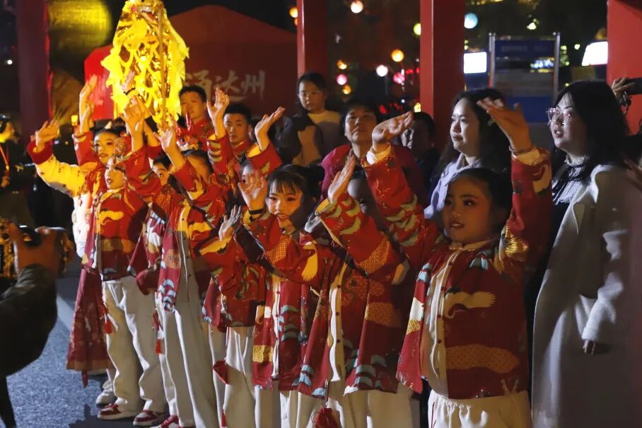 2月25日,农历正月初九,正值达州传统佳节“元九登高”。当晚,莲花湖畔灯火璀璨、人声鼎沸。“潮涌达州 春满通川”2026达州市通川区“元九登高”暨大型非遗民俗巡演,在莲花湖片区金龙大道至巴山大剧院沿线火热上演。千年非遗与新春民俗碰撞交融,为市民游客带来了一场沉浸式的文化盛宴。