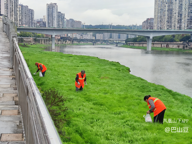 李大姐个子不高,皮肤黝黑,那是长年河风吹日晒留下的印记。第一次引起我注意,是在一个暴雨后的清晨。河水上涨,上游冲下来的漂浮物挂满了河岸的树枝和石逢......李大姐穿着那件醒目的橘红色马甲,腰系绳索,攀爬在护栏上,正艰难地用长钳去夹那些卡在石缝里的塑料瓶。那动作,既惊险又精准,像极了当年我们在战壕里匍匐作业的身影。